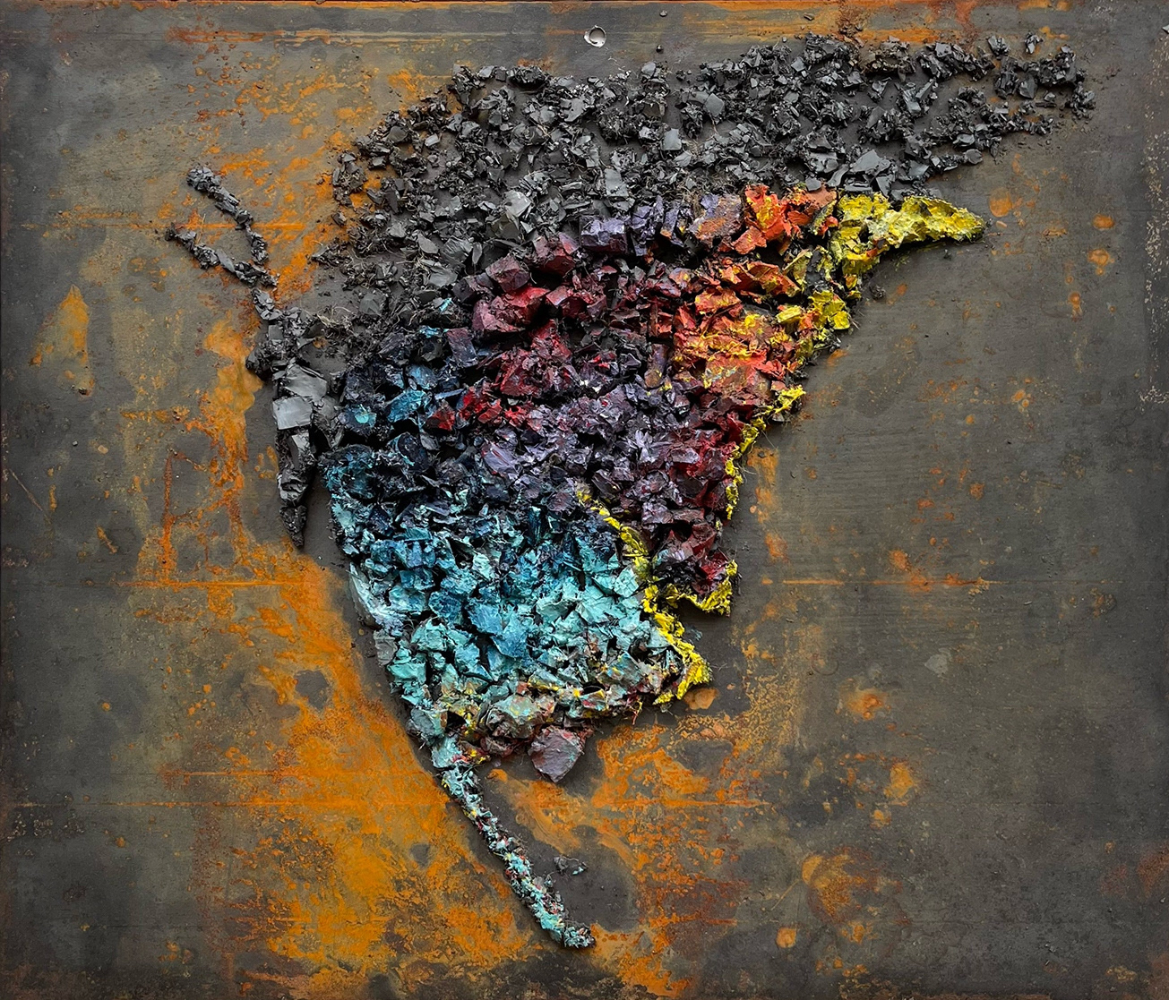 Morpho symbolise la subtilité, la solidité et la variabilité de l'art. Sa fabrication a impliqué l'utilisation d'aimants et de planches de fer oxydées par le temps.