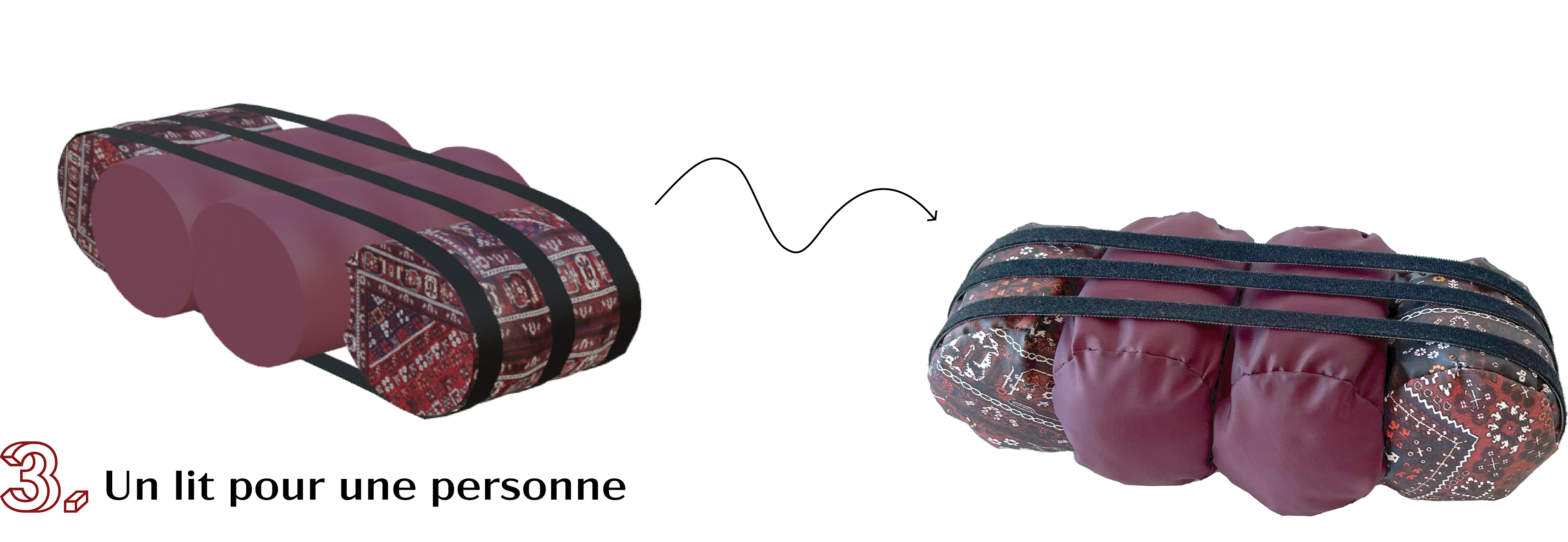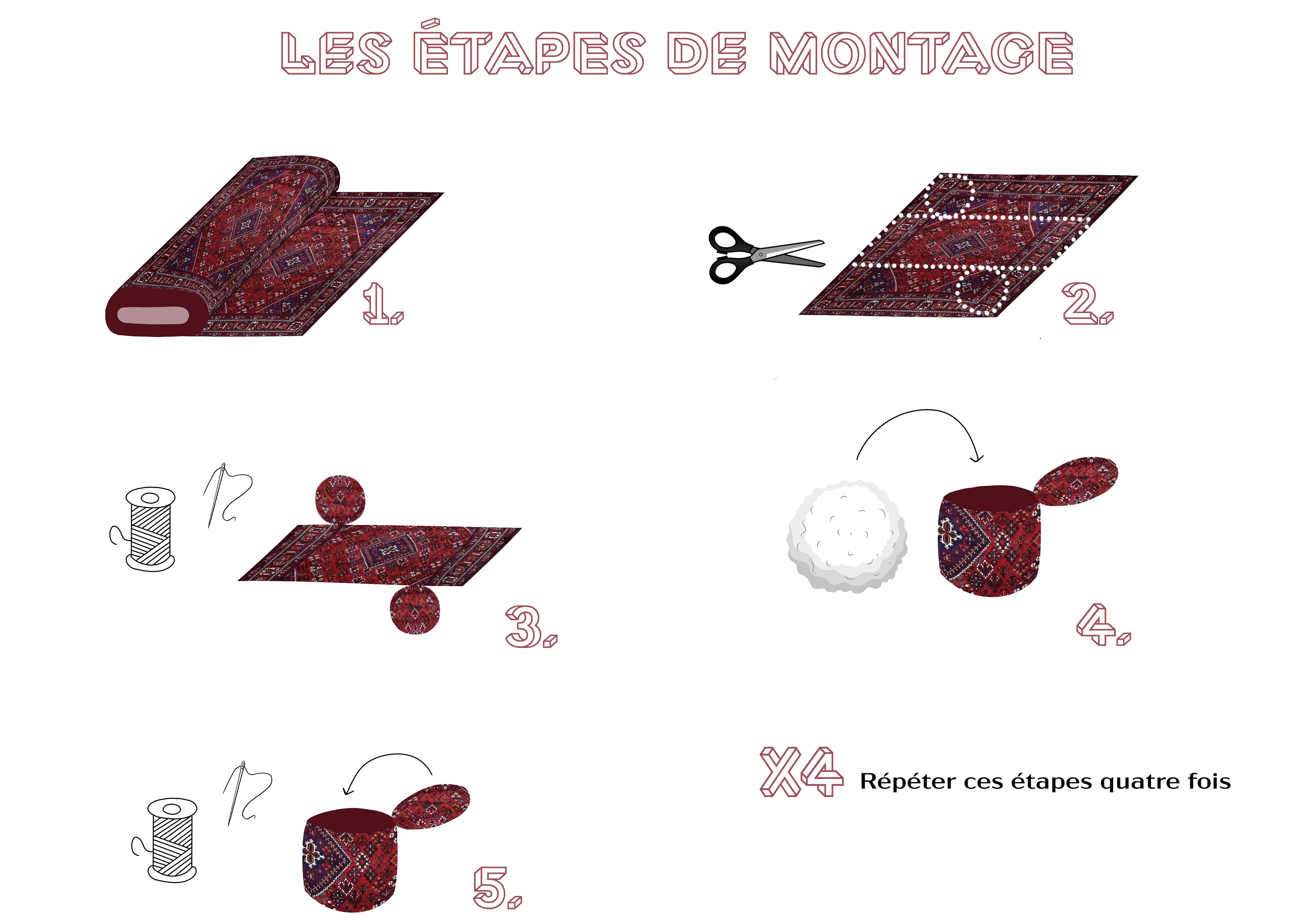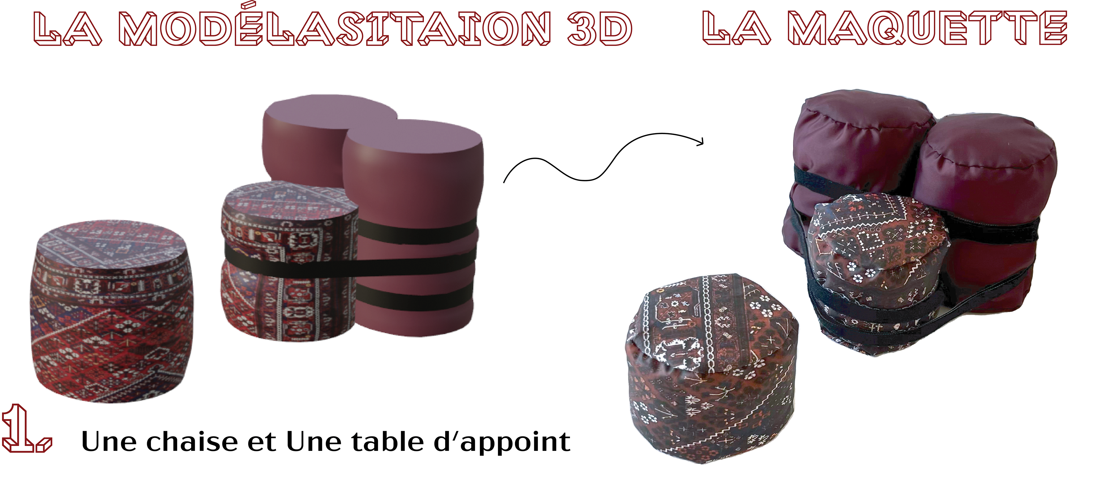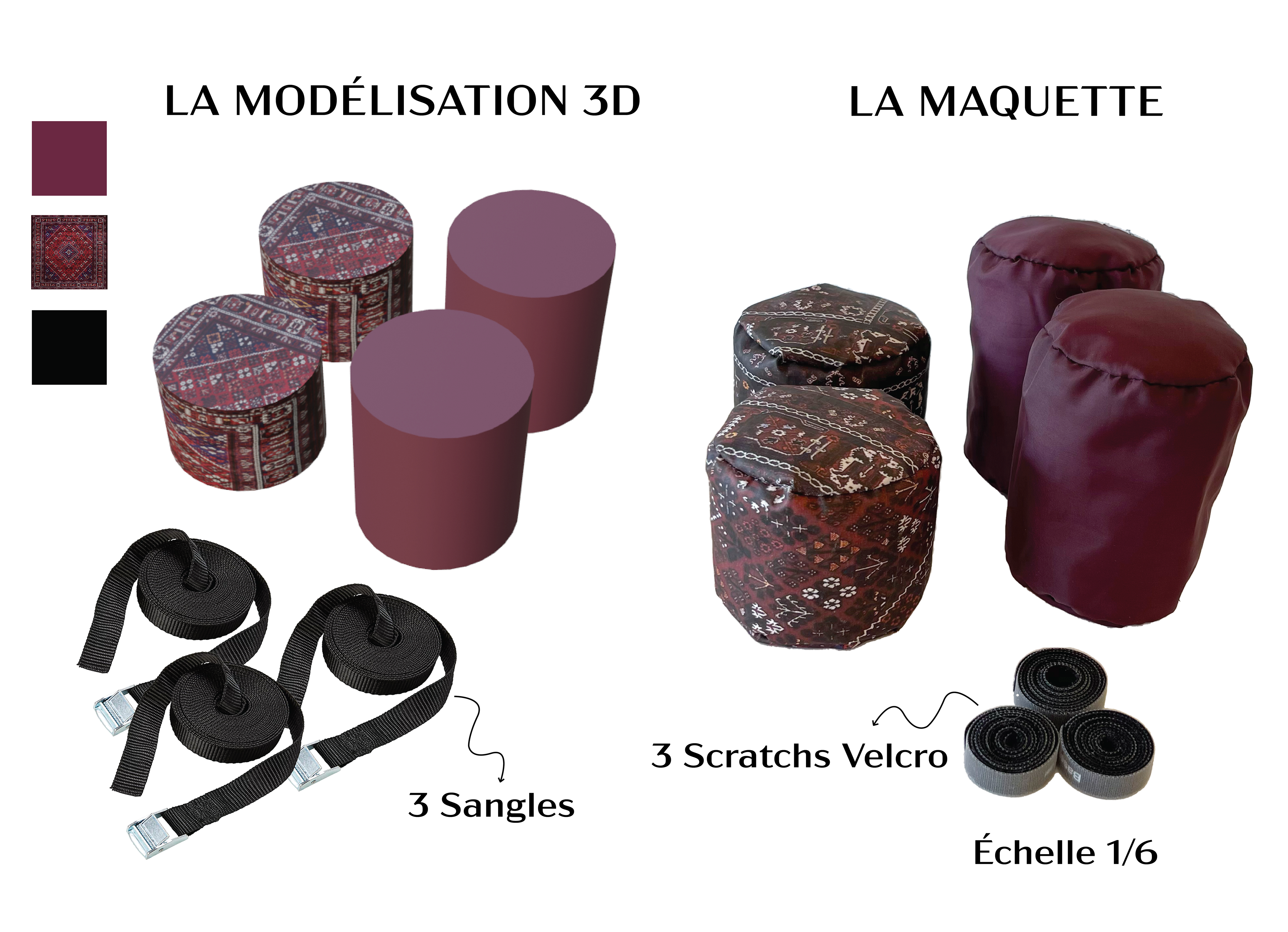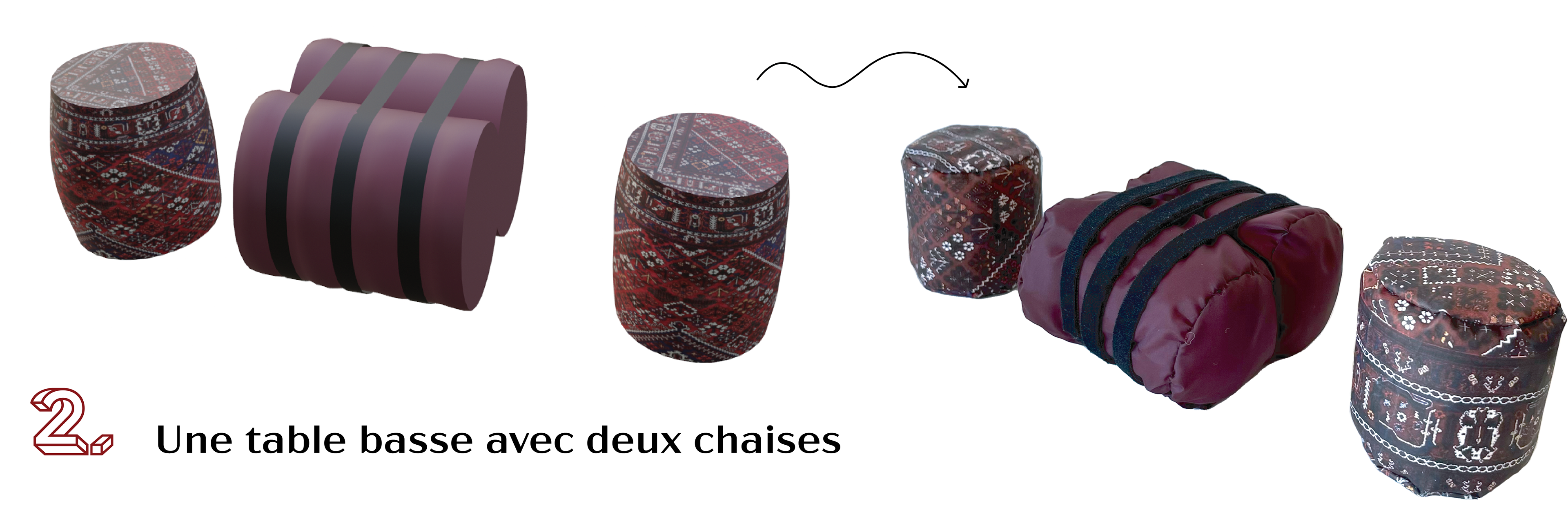 J'ai conçu un pouf multi-usage qui peut être transformé en trois types de meubles différents en assemblant les quatre poufs avec des sangles. Pour ajouter une touche d'esthétique, j'ai utilisé du tissu iranien pour la finition de ces meubles.